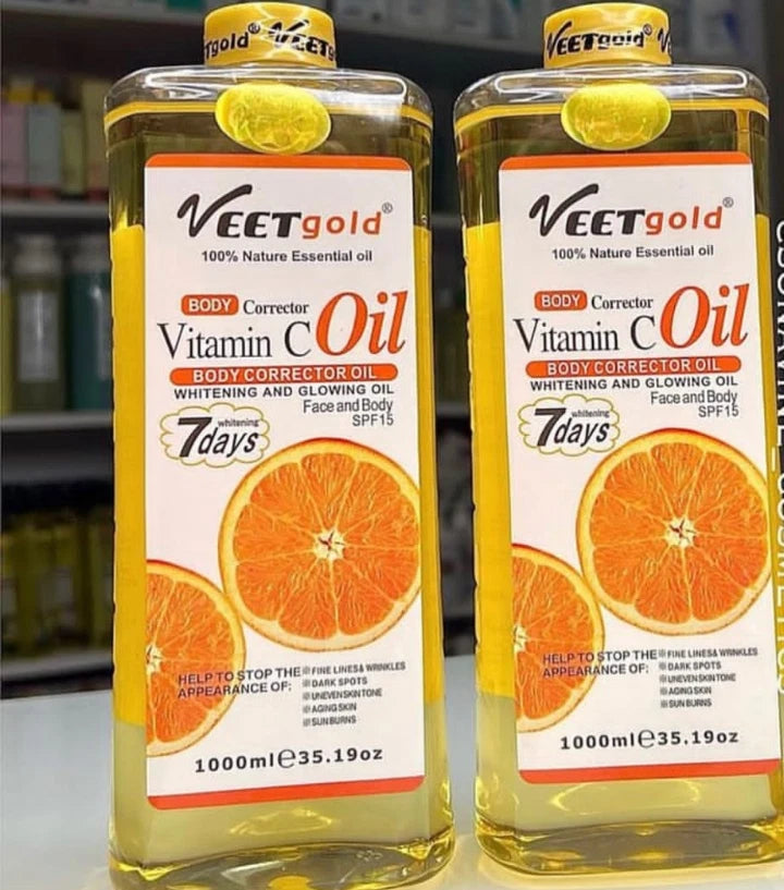Maximize your radiance with the generous 1000ML size of Veet Gold Body. Corrector and Glowing Oil. Formulated with natural plant extracts and essential oils, this luxurious oil is designed to smooth, nourish, and enhance your skin's natural glow for a visibly bright and even-toned appearance.